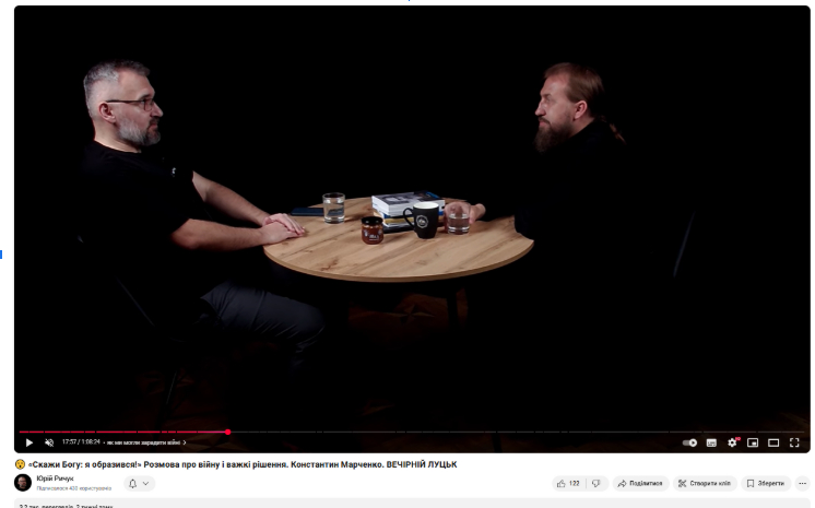 Також Юрій записав розмову з архімандритом Константином Марченком, настоятелем Жидичинського Свято-Миколаївського монастиря, про війну та віру в Бога. Крім того, він розповів, що нижній Успенський храм зареєстрували як укриття. Це відео, що набрало найбільшу кількість переглядів (3,2 тис.) цього року, “Скажи Богу: я образився!” Розмова про війну і важкі рішення. Константин Марченко”.