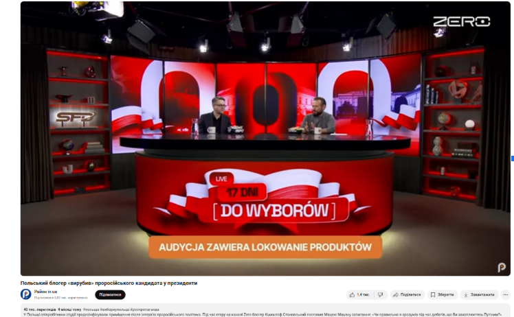Найбільше ж переглядів на каналі має відео “Польський блогер “вирубив” проросійського кандидата у президенти“. У ньому йдеться про те, що під час ефіру на каналі Zero ведучий Кшиштоф Становський запитав політика Мацея Мацяку, чи він захоплюється Путіним. Гість відповів, що поважає, як і інших людей. У результаті політик залишився сам у студії з вимкненим мікрофоном.