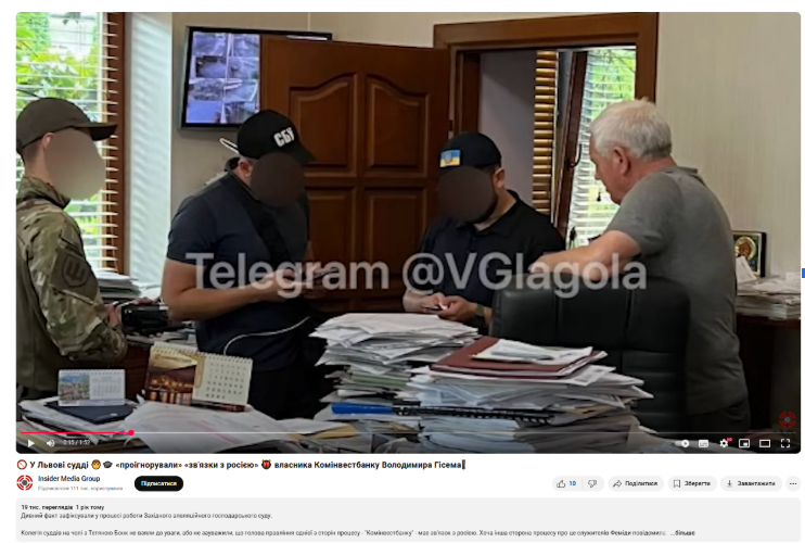 Наразі найбільше переглядів на ютуб-каналі Insider Media, 19 тисяч, зібрало відео від вересня 2024 року “У Львові судді проігнорували зв’язки з Росією власника Комінвестбанку Володимира Гісема”, під час обшуків у якого знайшли портрет російського президента Путіна і печатки чинних російських підприємств.
