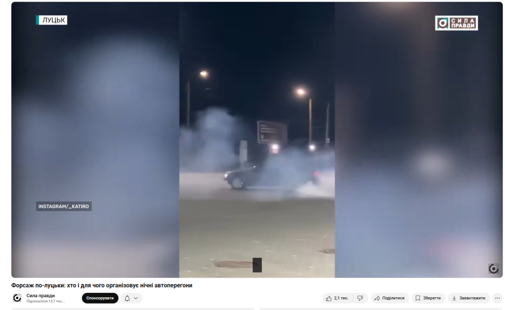 Розслідування “Форсаж по-луцьки: хто і для чого організовує нічні автоперегони” про автоперегони в Луцьку та дрифтування молоді на автівках, опубліковане в червні 2025 року, набрало понад 75 тисяч переглядів. Основою розслідування стали відео, які викладали самі гонщики в соцмережі.
