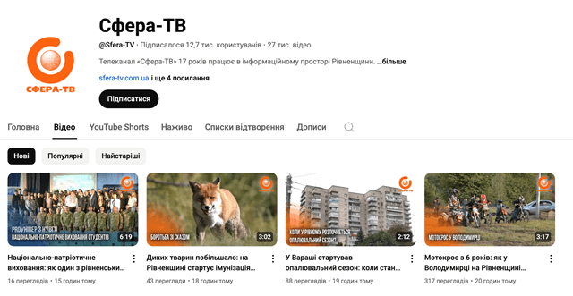 Також у Сфера-ТВ є два YouTube-канали – партнери: “Пакуємо валізи” (тревел-блог рівненської медійниці Тетяни Волкової з 86,3 тисячі підписок) і “Чоловічий стандарт” (канал про дозвілля, який має 46 тисяч підписників).