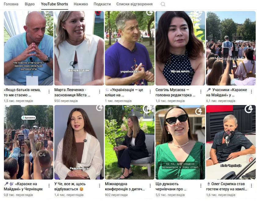Shorts-відео від C4 також створюються систематично. У них медійники подають головні новини, тези міського голови зі щомісячних конференцій та важливі фрагменти з повноформатних інтерв’ю. Окремо для Shorts створено й рубрику “В Чернівцях та області щось відбувається?”, де журналістка ділиться головними подіями на Буковині. До прикладу, якщо сюжет на півтори хвилини про сурмача, який допомагає ЗСУ, зібрав 128 переглядів і дві вподобайки, то 40-секундний Shorts про цього ж героя мав 5300 переглядів й 100 вподобайок. Така сама ситуація і з іншими новинами.