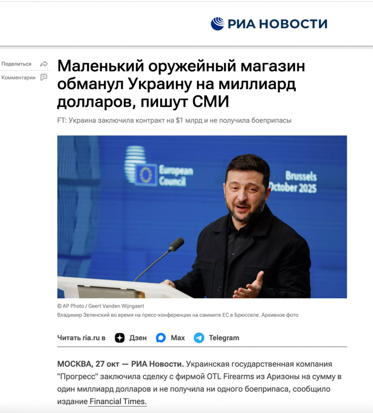 Скриншот публікації на «РИА Новости». Джерело: StopFake