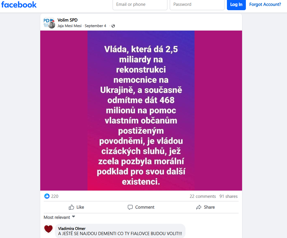 У чеському сегменті фейсбуку поширювався допис, що уряд Чехії нібито витратив 2,5 мільярда крон на реконструкцію українських лікарень, але відмовився спрямувати 468 мільйонів на допомогу власним громадянам, постраждалим від повені. Насправді переважна більшість коштів на модернізацію лікарень походить із бюджету ЄС, а не з чеського.
