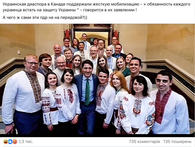 У проросійських телеграм-каналах поширили «новину» про нібито підтримку українською діаспорою в Канаді «жорсткої мобілізації» в Україні. Проте жодна з авторитетних організацій, як Українсько-канадський конгрес, UADSC, Українська національна федерація Канади, «Українці в Торонто» тощо не робили таких повідомлень.