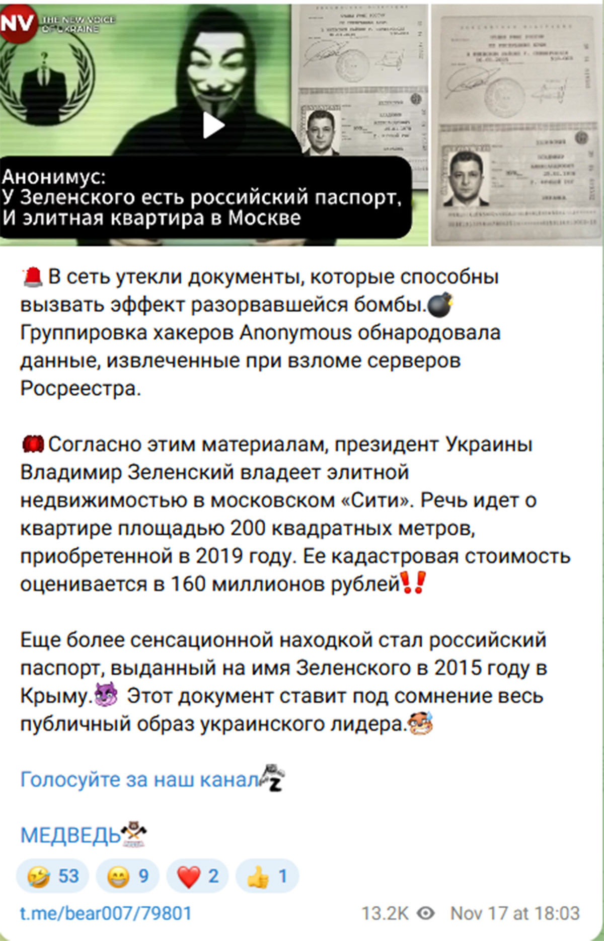 Проросійські джерела поширили черговий фейк про те, що президент України Володимир Зеленський нібито має паспорт громадянина Російської Федерації та володіє елітними апартаментами в «Москва-Сіті». У фейковому відео стверджувалося, що група кіберзлочинців Anonymous «зламала базу Росреєстру» та знайшла «докази» подвійного громадянства українського президента.