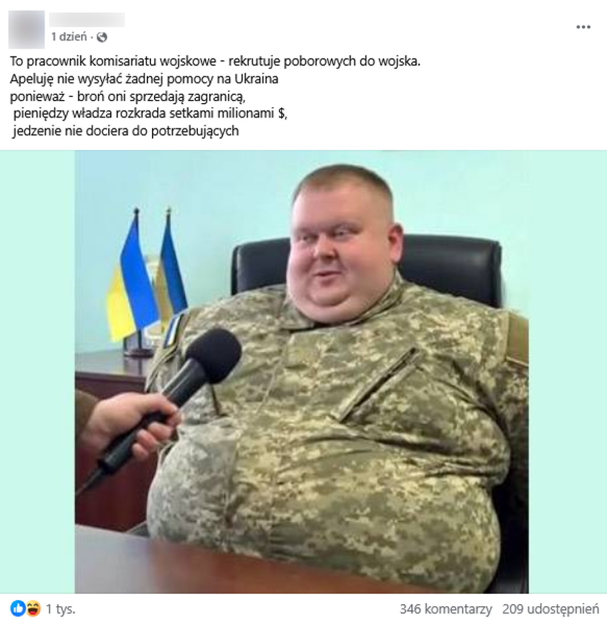 У соціальних мережах, зокрема у польському сегменті фейсбуку, поширюють «фотографії» чоловіка з надмірною вагою в українській військовій формі. Автори публікацій стверджують, що це офіцер, який керує мобілізацією в українській армії, і його зовнішність нібито доводить, що міжнародна допомога «не потрапляє до тих, хто її дійсно потребує». Такі публікації набирали сотні коментарів і репостів. Насправді людини з фото не існує, а зображення створене штучним інтелектом із метою розпалювання антиукраїнських настроїв.