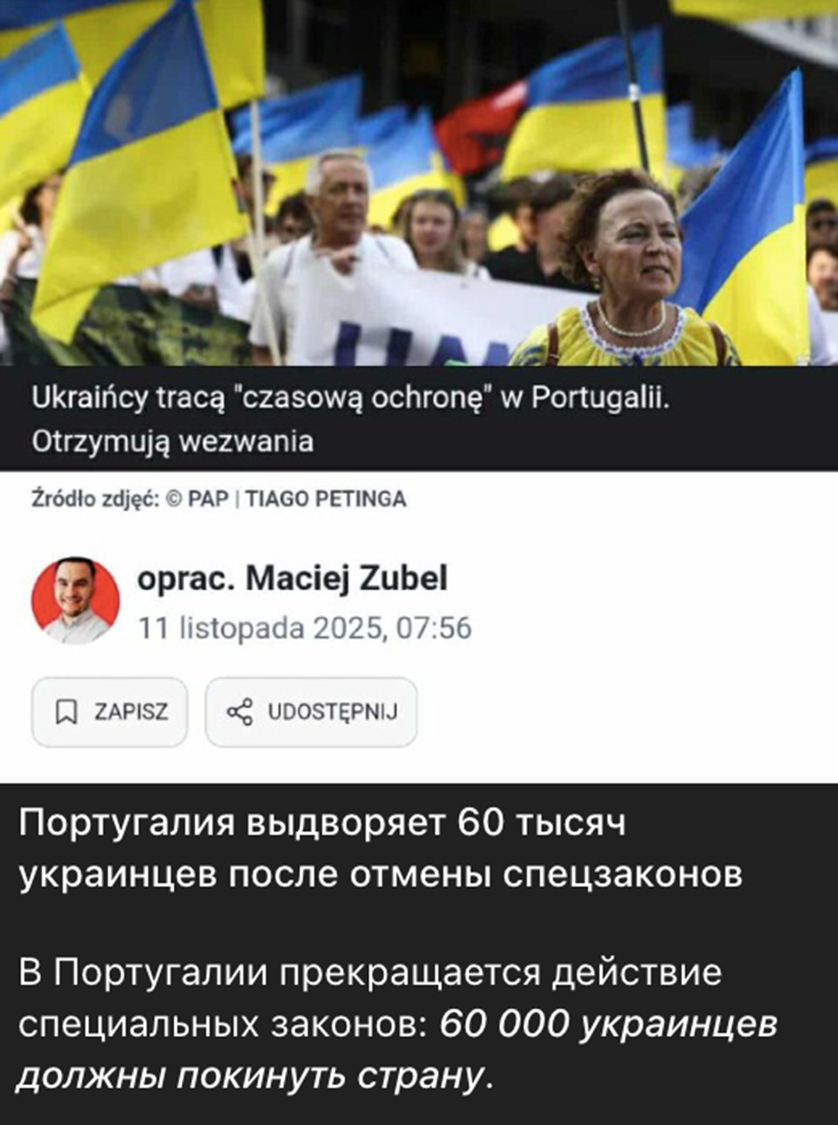 Дезінформаційні кампанії поширюються і в європейському інформаційному просторі. Цього разу проросійські ресурси почали поширювати твердження, ніби Португалія готується депортувати 60 тисяч українських біженців. Пропагандисти описують ситуацію як «утому Португалії від українців», водночас покликаючись на процес оновлення дозволів на проживання.