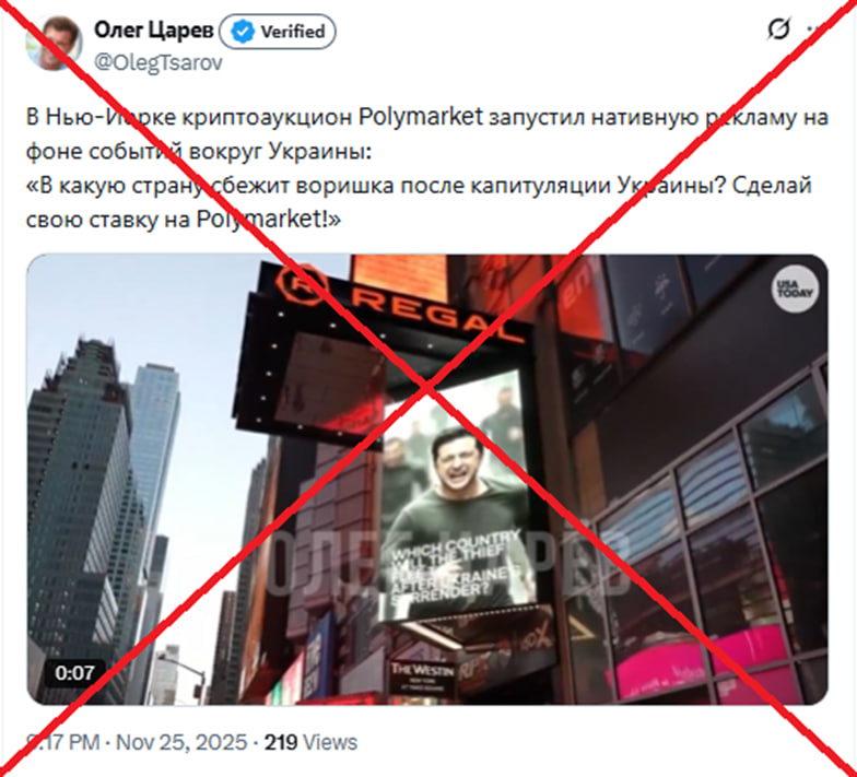 У соцмережах поширюють відео з нібито рекламою у центрі Нью-Йорка, яка пропонує робити ставки на «втечу президента Зеленського з України». Насправді ролик — підробка: зображення створене за допомогою монтажу та накладання анімації на відео з екранів Таймс-сквер.