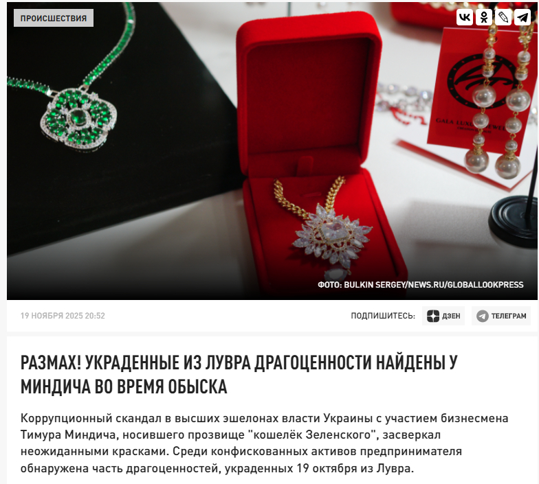У соцмережах поширили відео, в якому стверджується, що під час обшуку в будинку Тимура Міндіча, колишнього бізнес-партнера президента Володимира Зеленського, нібито знайшли ювелірні вироби, викрадені з паризького Лувру. Автори публікацій демонструють фото намиста поруч із грошима, подаючи це як «доказ» причетності українського бізнесмена до міжнародної крадіжки. У коментарях пропагандисти додають, що знайдені «коштовності» збігаються з тими, що були викрадені під час нещодавнього пограбування музею.