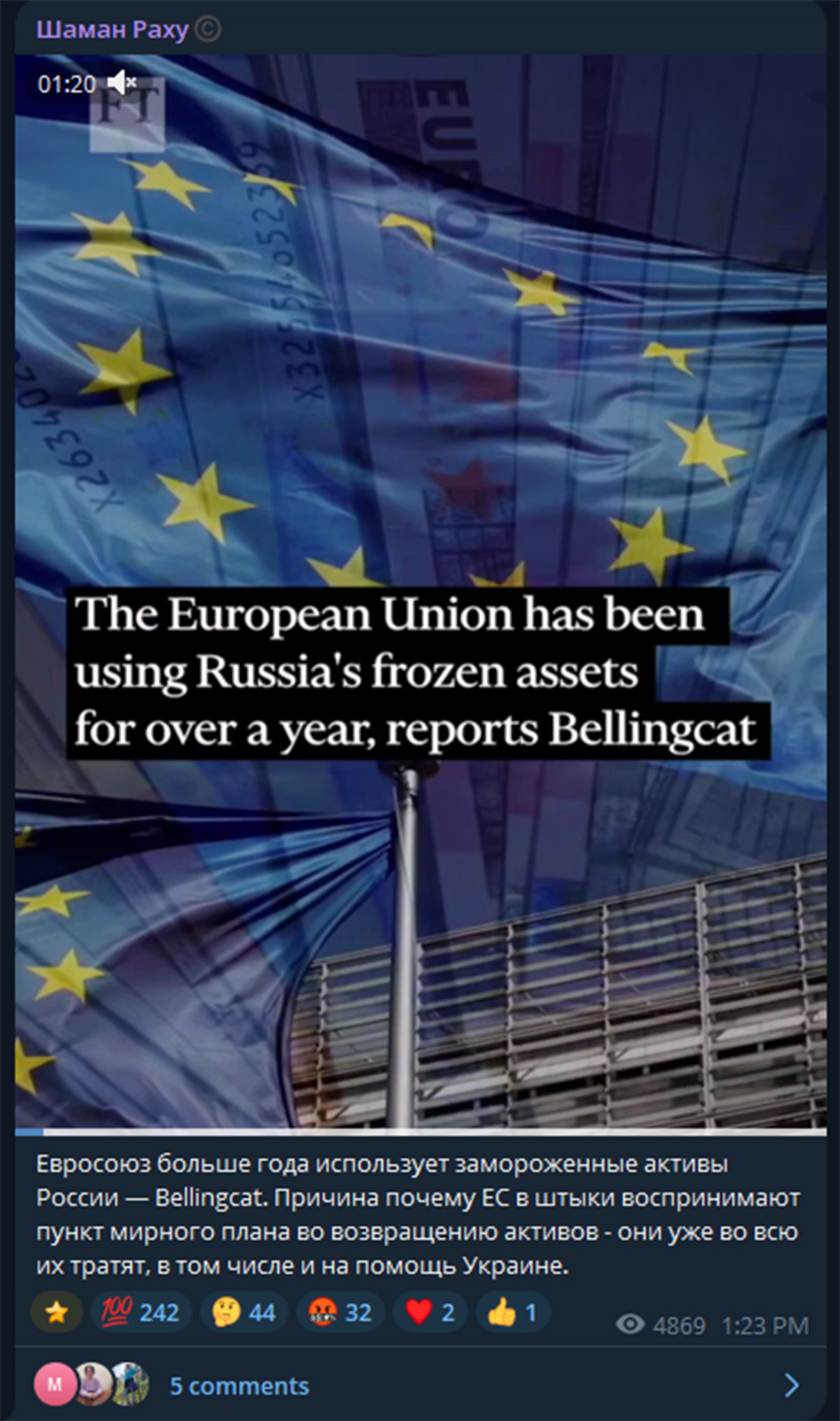 У проросійських телеграм-каналах ширили відео, стилізоване під відеопродукт видання Financial Times, де стверджувалося, що розслідувачі Bellingcat нібито довели розтрату ЄС заморожених активів Росії. Автори відео запевняли, що гроші були витрачені на «молоді демократії» та приватні кишені європейських бюрократів. Насправді Financial Times ніколи не публікувало такого матеріалу, а Bellingcat не проводило подібних розслідувань.