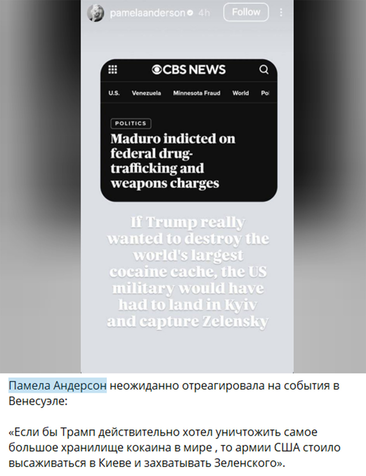 Проросійські телеграм-канали прив’язали до подій у Венесуелі й Україну. Вони виготовили й поширювали фейк, нібито американська акторка Памела Андерсон висловилася, що Україна є «найбільшим сховищем кокаїну у світі». Насправді акторка не публікувала й не говорила таких слів, а її офіційна сторінка в інстаграмі містить лише посилання на щоденник актриси у Substack.