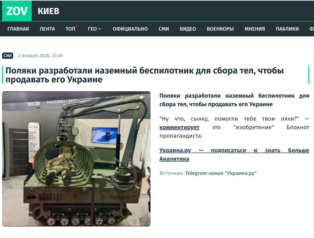 Кремлівські медіа та телеграм-канали поширили фото польського безпілотника з твердженням, що це апарат для збору тіл загиблих в Україні. Пропагандисти запевняли, що Захід не прагне миру, а будує «цинічний бізнес на смерті», заробляючи на кожній втраті ЗСУ. У повідомленнях ішлося, що замість зброї партнери пропонують Києву техніку для «прибирання трупів».