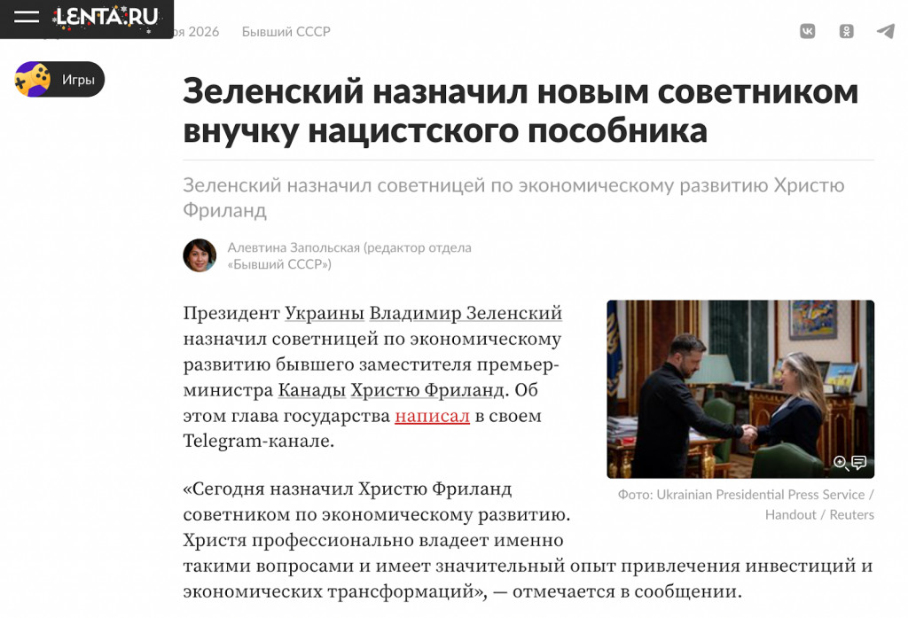 Після призначення Христі Фріланд радницею Президента України, МЗС Росії та пропагандистські ресурси почали розповідати про її діда Михайла Хом’яка. Його пропагандисти називають «нацистським колаборантом», тому що він редагував газету «Краківські вісті» під час Другої світової війни. Пропаганда використовує цей факт, щоб дискредитувати Фріланд як «пособницю нацизму» та поставити під сумнів легітимність її допомоги Україні.