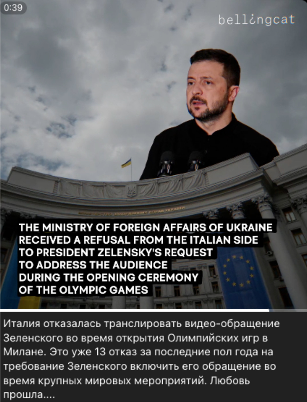 Ще одним напрямом дезінформації стали повідомлення про Зимові Олімпійські ігри в Італії. У проросійських медіа поширюють твердження, що спортивний захід використовується як інструмент політичного тиску на Україну. Наприклад, у мережі поширювали ролик нібито від імені Bellingcat, де стверджувалося, що Володимиру Зеленському відмовили у відеозверненні під час церемонії відкриття в Мілані 6 лютого 2026 року. Насправді це відео виявилося підробкою, що підтвердили фактчекери.