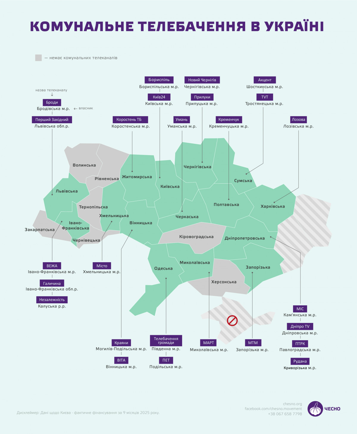 Реєстр суб’єктів у сфері медіа від Нацради з питань телебачення і радіомовлення, згідно з інформацією на її сайті, нині перебуває на стадії розробки через оновлення медійного законодавства. Проте тут є Перелік суб’єктів у сфері медіа станом на 1 жовтня 2025-го. У ньому — майже дві сотні записів із позначкою «комунальні», тобто такі, що фінансуються з місцевих бюджетів. Частина — вузькоспеціалізована, як-от альманах Вінницького обласного центру народної творчості чи науковий збірник Центру консервації предметів археології. Не мають жодного комунального медіа лише Волинь, Закарпаття й Тернопільщина, а всі херсонські — тимчасово не діють.