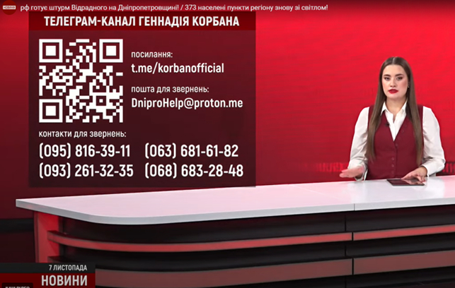 А ще в кожному випуску є обов’язковий елемент. Дніпрянам нагадують про єдину гарячу лінію Дніпровської міської ради та про можливість подати заявку до штабу взаємодопомоги громадської ради, яку очолює Геннадій Корбан.