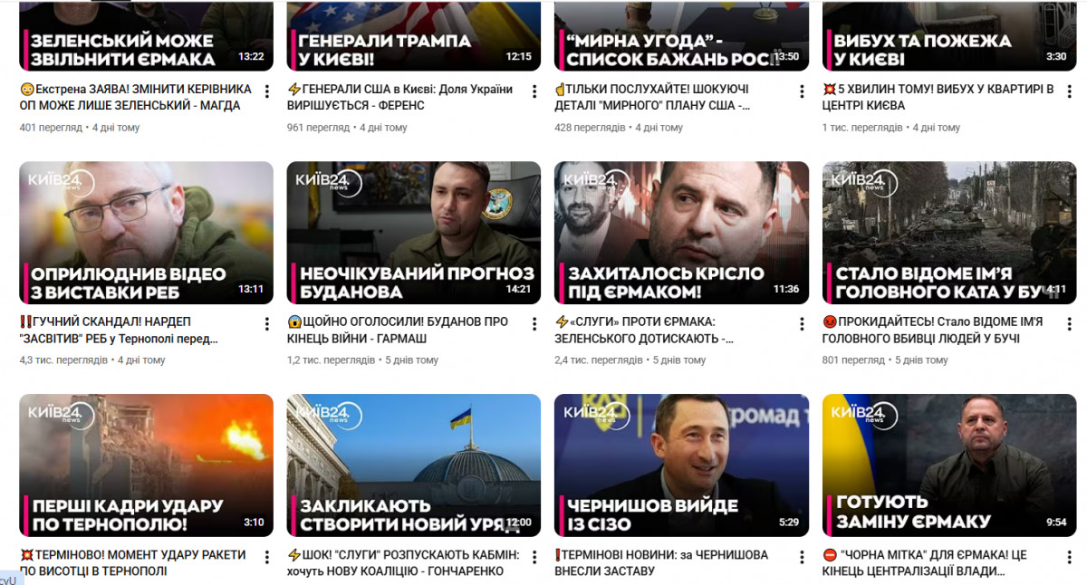Скриншот списку відео ютуб-телеканалу «Київ» із клікбейтними заголовками