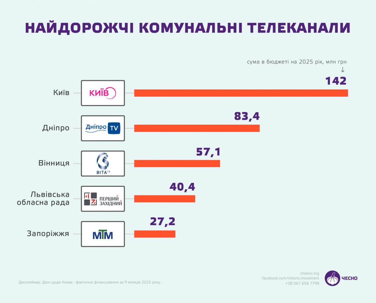 Найбільше коштів на утримання комунальних медіа витрачають кияни. У власності міської ради столиці є телеканал «Київ» і радіостанція «Голос Києва». Згідно зі звітом про виконання бюджету Києва за 9 місяців 2025-го, фінансування першої вже обійшлося в понад 142 мільйони гривень, а другої — в майже 20.