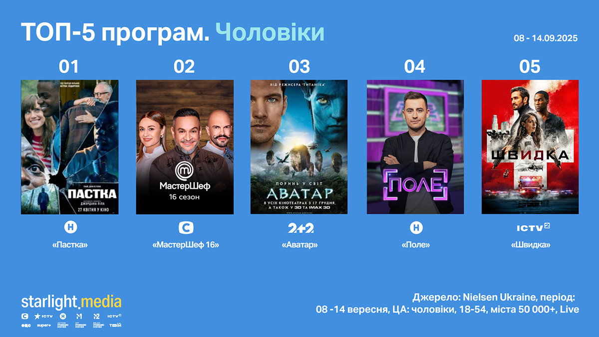 Рейтинг програм тижня за чоловічою аудиторією також очолив фільм «Пастка» на Новому каналі (rat 3,04%; shr 16,59%). Другу сходинку посів «МастерШеф-16» на СТБ (rat 2,37%; shr 11,9%). Третє місце — за фільмом «Аватар» на «2+2» (rat 2,33%; shr 10,56%), четверте — за шоу «Поле» на Новому каналі (rat 2,2%; shr 11,22%). Провідну пʼятірку закрив фільм «Швидка» на ICTV2 (rat 2%; shr 10,31%).