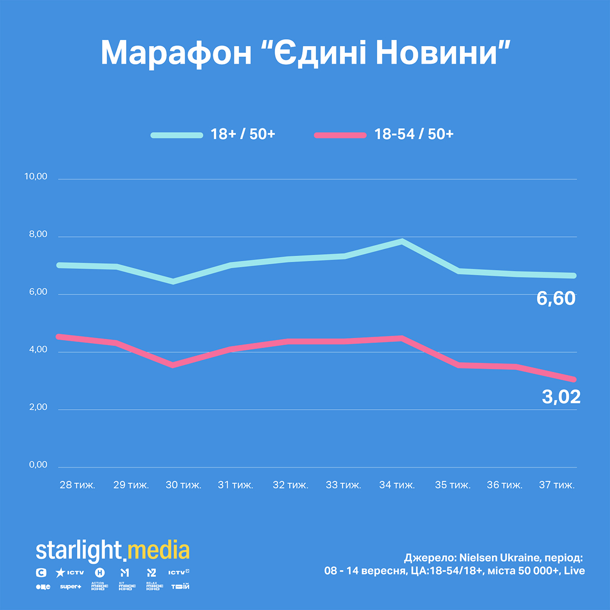 Звітного тижня показники каналів, які транслюють об’єднаний марафон «Єдині новини», зменшилися за комерційною аудиторією 18—54, 50 тис.+ на 12% (частка 3,02%) й утрималися на рівні 6,60% за широкою аудиторією 18+, 50 тис.+.