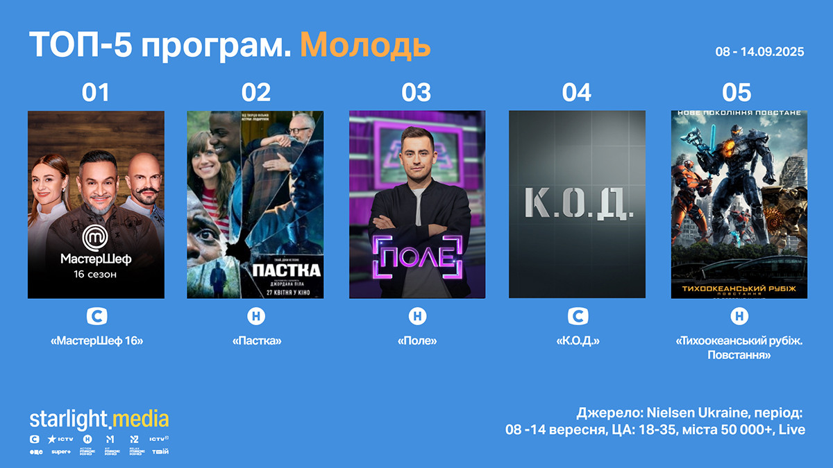 «МастерШеф-16», «Покутні. Разом по світу» та гра збірної з футболу. Як дивилися телеканали 8—14 вересня 2025 року