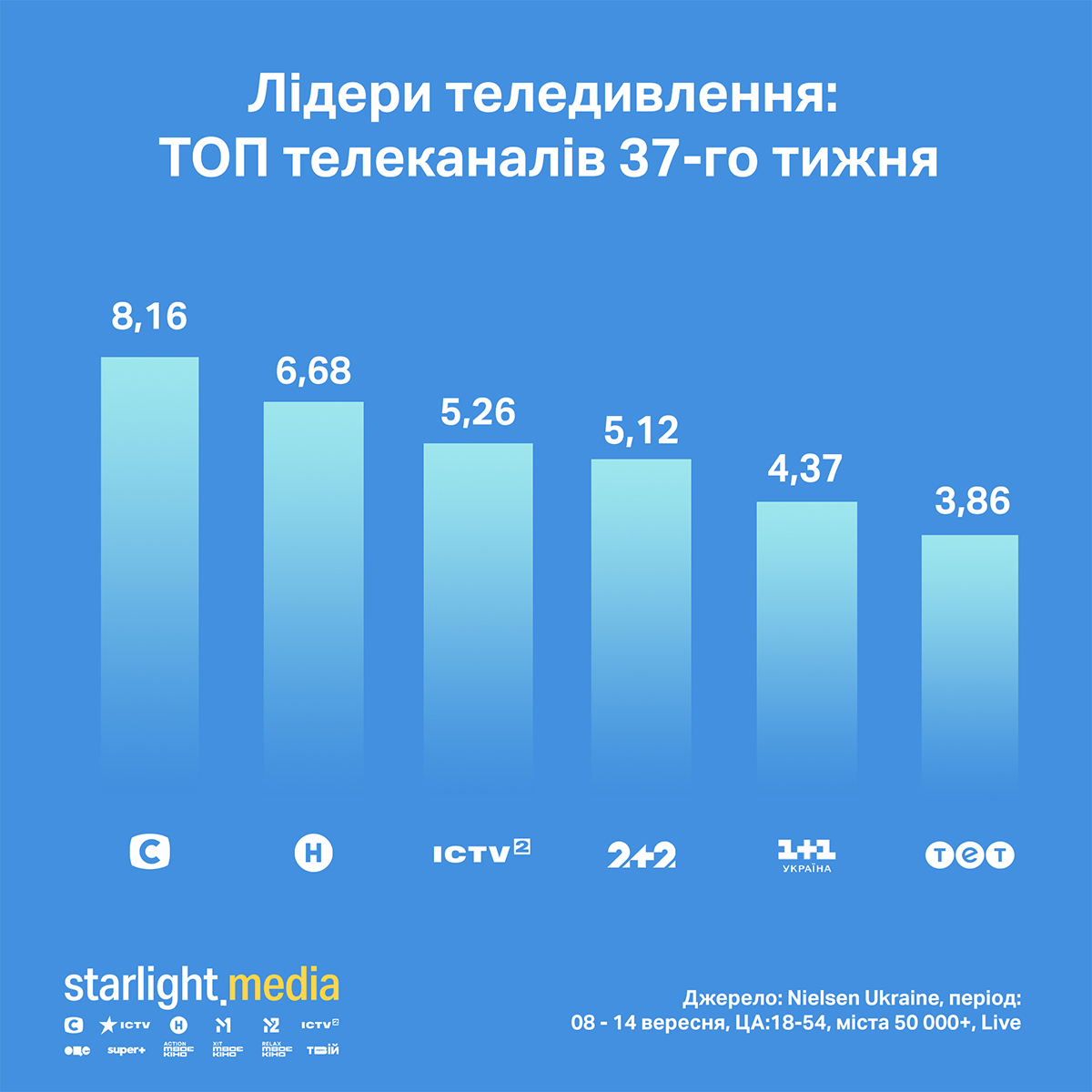 Лідери телеперегляду. Провідні українські телеканали за підсумками 37 тижня 2025 року (8—14 вересня)