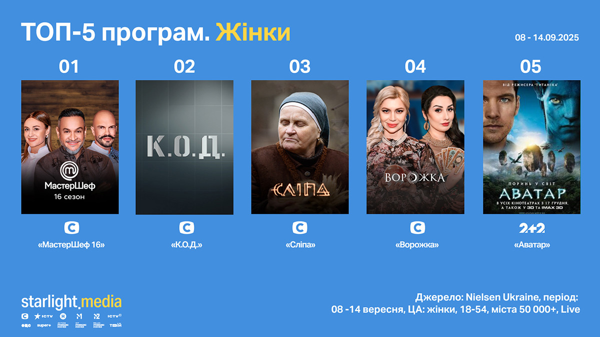 Рейтинг найпопулярніших програм тижня за жіночою аудиторією очолили серіали та шоу на СТБ: «МастерШеф-16» (rat 3,61%; shr 15,5%), «К.О.Д.» (rat 3,03%; shr 12,32%), «Сліпа» (rat 2,98%; shr 12,15%) та «Ворожка» (rat 2,37%; shr 22,72%). Пʼятірку закрив фільм «Аватар» на «2+2» (rat 2,32%; shr 9,29%).