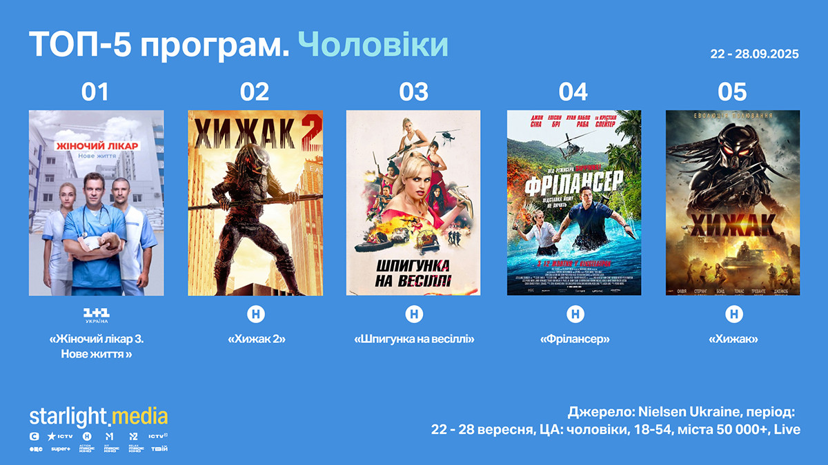 Рейтинг програм тижня за чоловічою аудиторією очолює «Жіночий лікар 3. Нове життя» (rat 2,83%, shr 11,86%). Закриває п’ятірку кінопоказ на Новому каналі «Хижак-2» (rat 2,63%, shr 14,13%), «Шпигунка на весіллі» (rat 2,39%, shr 11,75%), «Фрілансер» (rat 2,2%, shr 8,83%) і «Хижак» (rat 2,14%, shr 9,92%).