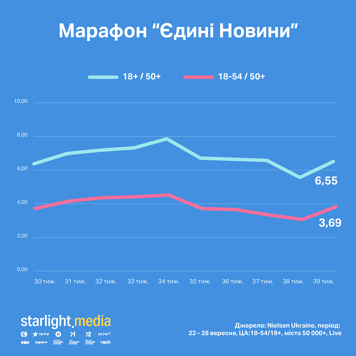 Показники каналів, які транслюють об’єднаний марафон «Єдині новини», зросла за комерційною аудиторією віком 18—54 років у містах із понад 50 тис. жителів на 35% (частка 3,59%) і за широкою аудиторією 18+ 50 тис.+ на 17% (частка 6,55%).