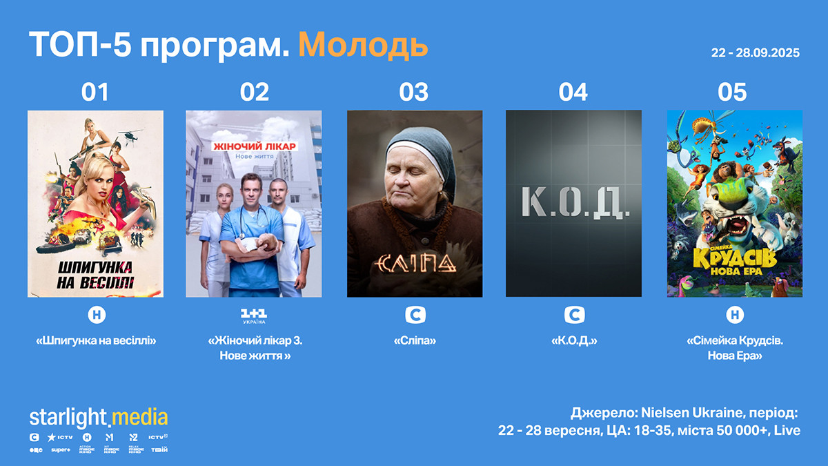 Фільм «Шпигунка на весіллі» на Новому каналі очолив рейтинг найпопулярніших програм тижня за молодою аудиторією (rat 2,81%, shr 20,00%). Далі — серіали «Жіночий лікар 3. Нове життя» на «1+1 Україна» (rat 2,62%, shr 14,94%), «Сліпа» на СТБ (rat 2,47%, shr 12,42%) і «К.О.Д.» (rat 2,45%, shr 13,47%). Закриває п’ятірку мультфільм на Новому каналі «Сімейка Крудсів. Нова Ера» (rat 2,35%, shr 17,36%).