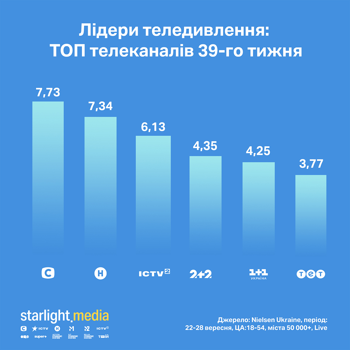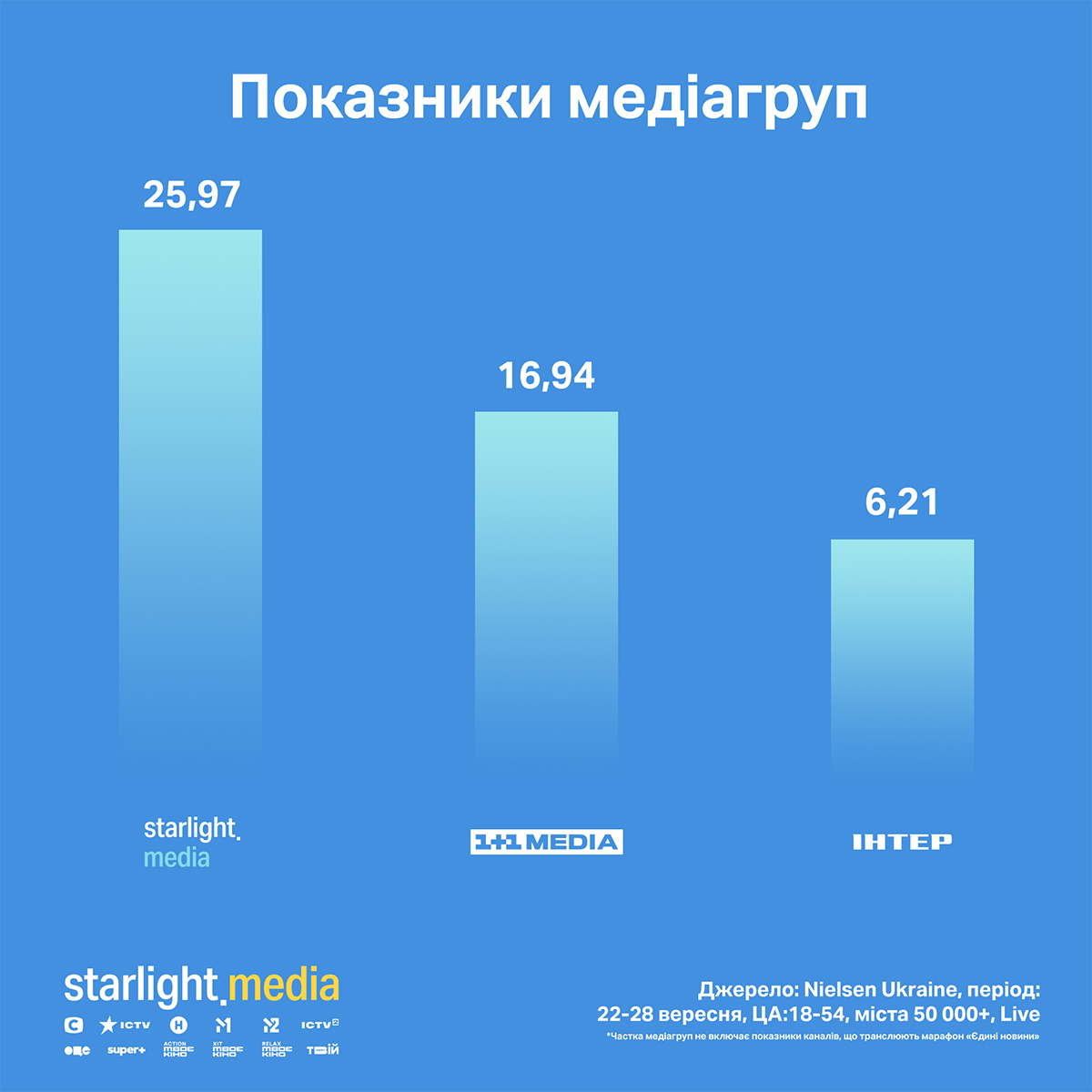 Наприкінці вересня Starlight Media утримувала перше місце серед українських медіагруп із часткою 25,97% (зростання 5% відносно попереднього тижня). На другому місці — «1+1 Media» з часткою 16,94% (зменшення 13%), Inter Media Group — на третьому місці з часткою 6,21% (зростання 3%).