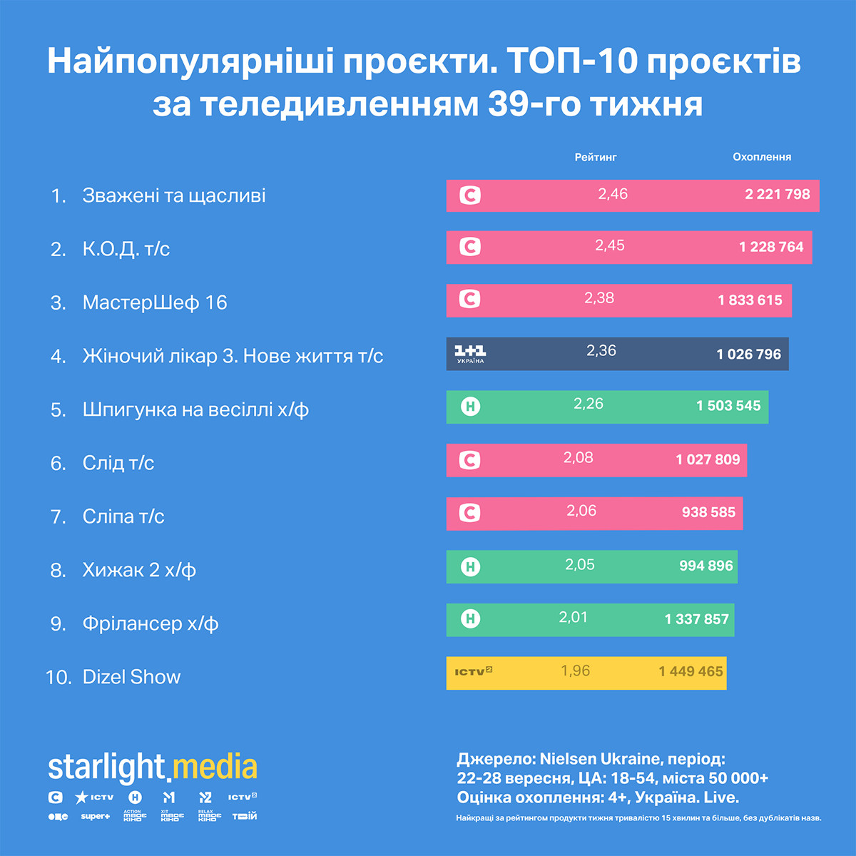 Лідери телеперегляду. Провідні українські телеканали за підсумками 39 тижня 2025 року (22—28 вересня)