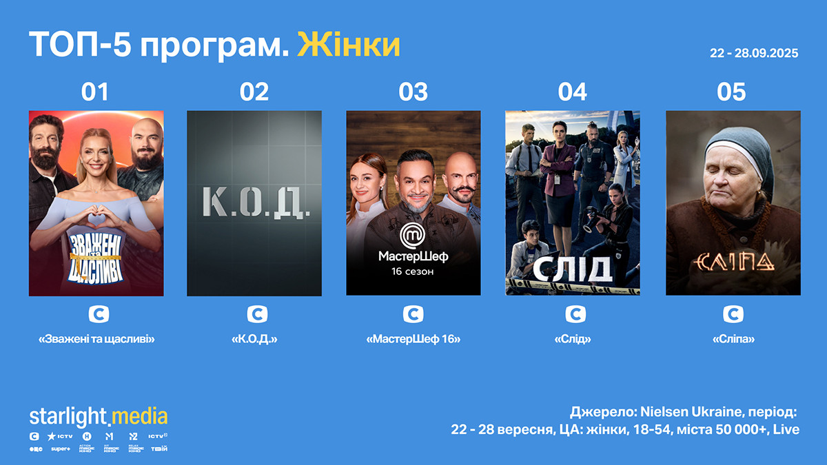 Контент СТБ продовжують очолювати рейтинг найпопулярніших програм тижня за жіночою аудиторією: «Зважені та щасливі» (rat 3,95%, shr 13,89%), «К.О.Д.» (rat 3,3%, shr 13,26%), «МастерШеф 16» (rat 3,04%, shr 13,15%), «Слід» (rat 2,75%, shr 13,47%) і «Сліпа» (rat 2,61%, shr 10,75%).