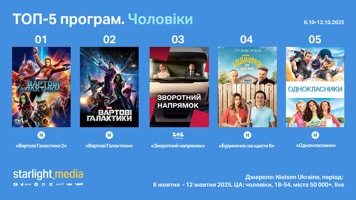 Рейтинг програм тижня за чоловічою аудиторією очолюють дві частини фентезійної франшизи «Вартові Галактики» на Новому каналі (перша — rat 2,4%, shr 10,59%, друга — rat 2,5%, shr 12,21%). Далі — серіали «Зворотний напрямок» на «1+1 Україна» (rat 2,35%, shr 10,59%) і «Будиночок на щастя 6» на Новому каналі (rat 2,2%, shr 11,74%). Закриває п’ятірку фільм «Однокласники» на Новому каналі (rat 2,09%, shr 9,46%).