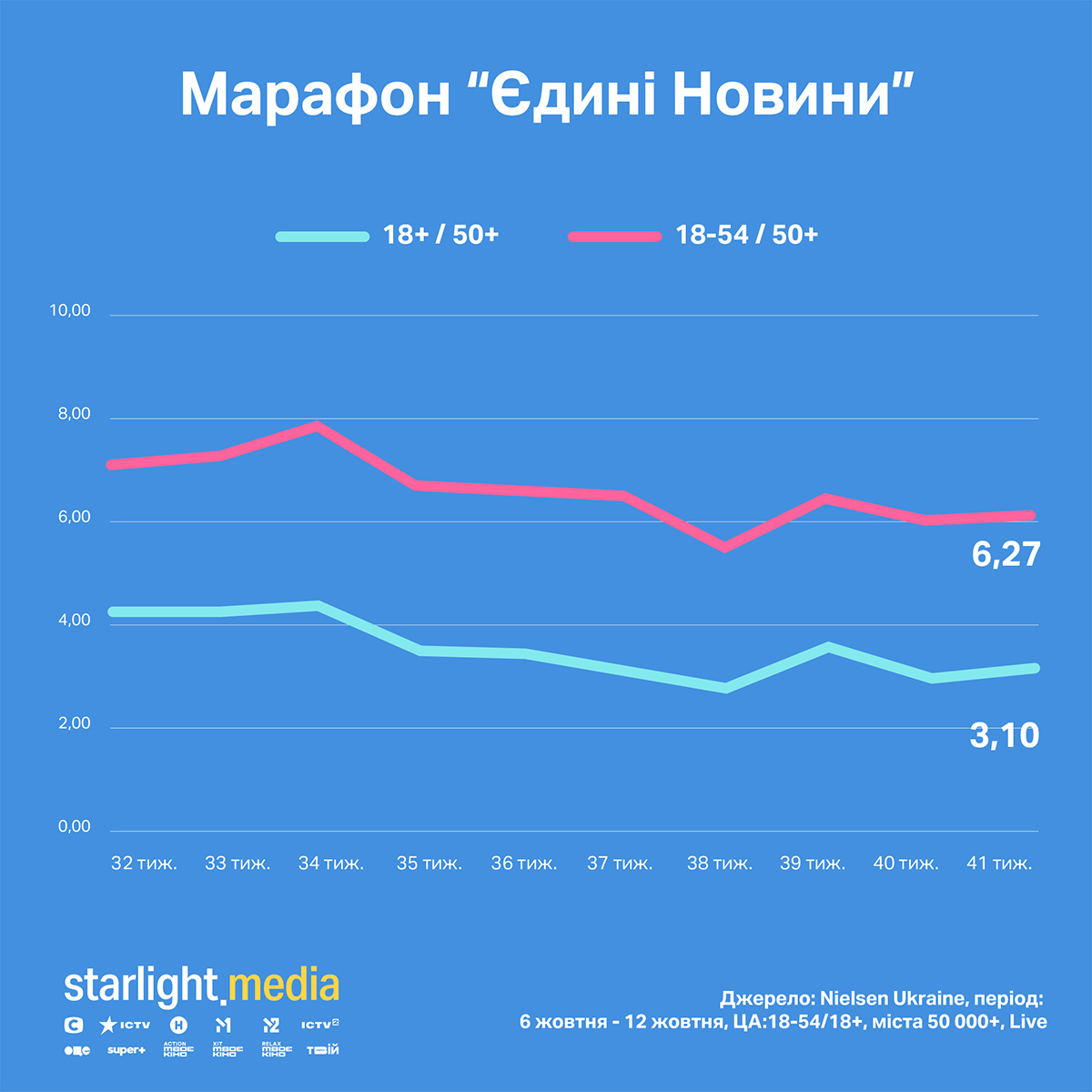 Показники каналів, які транслюють об’єднаний марафон «Єдині новини», зросли за комерційною аудиторією віком 18—54 років у містах із понад 50 тис. населення на 7% (частка 3,10%) і утримались на рівні 6,27% за широкою аудиторією 18+ 50 тис.+.