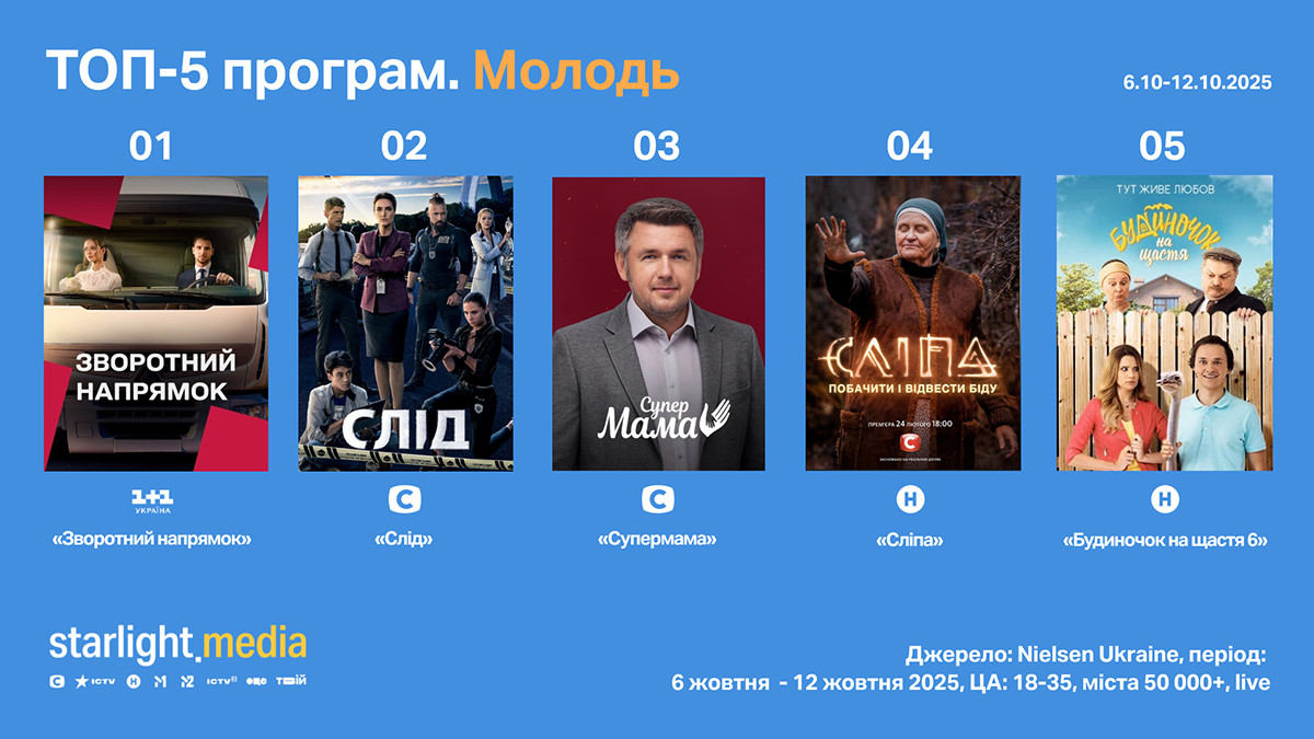Серіали очолюють перелік: «Зворотний напрямок» на «1+1 Україна» (rat 3,27%, shr 17,02%), «Слід» (rat 2,39%, shr 20,18%) і «Сліпа» (rat 2,22%, shr 13,73%) на СТБ, а також «Будиночок на щастя 6» на Новому каналі (rat 2,17%, shr 13,27%). Ще одне місце — за проєктом «Супермама» на СТБ (rat 2,29%, shr 14,95%).