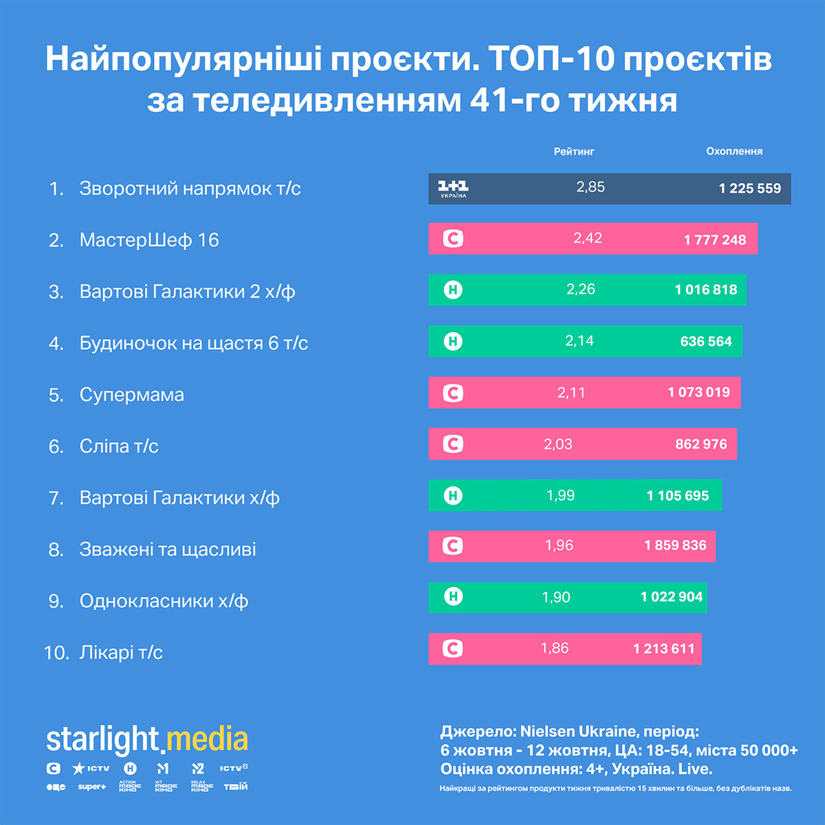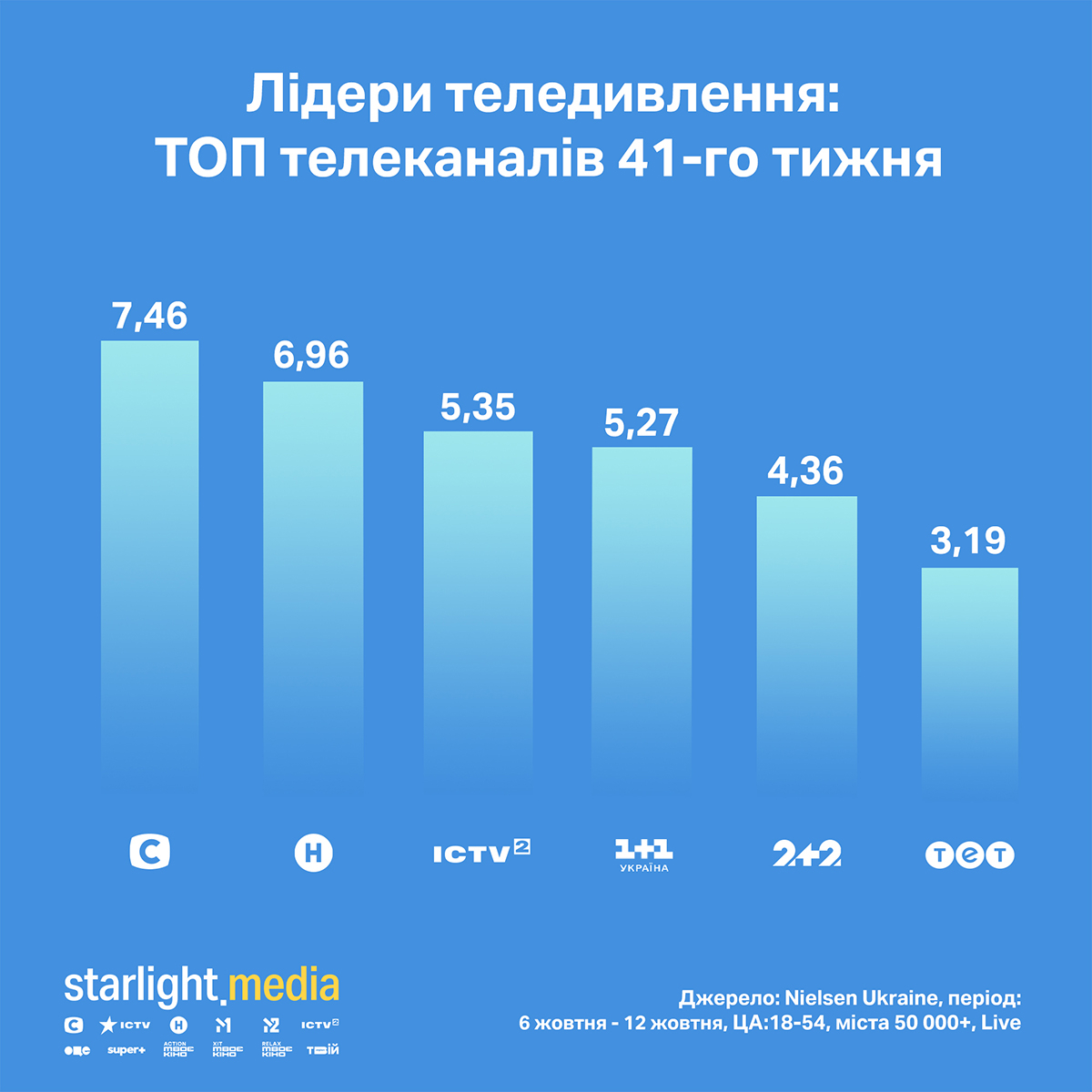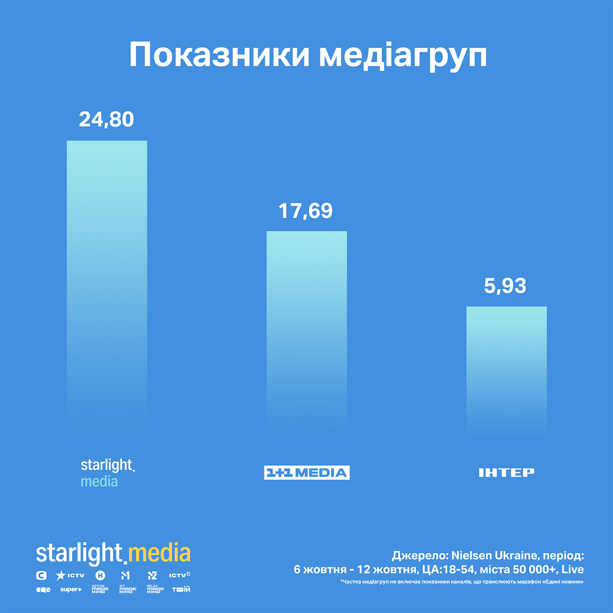 У середині жовтня Starlight Media утримувала перше місце серед українських медіагруп із часткою 24,80% (зменшення 3% відносно попереднього тижня). На другому місці — «1+1 Media» з часткою 17,69% (без змін), Inter Media Group — на третьому місці з часткою 5,93% (зменшення 2%).