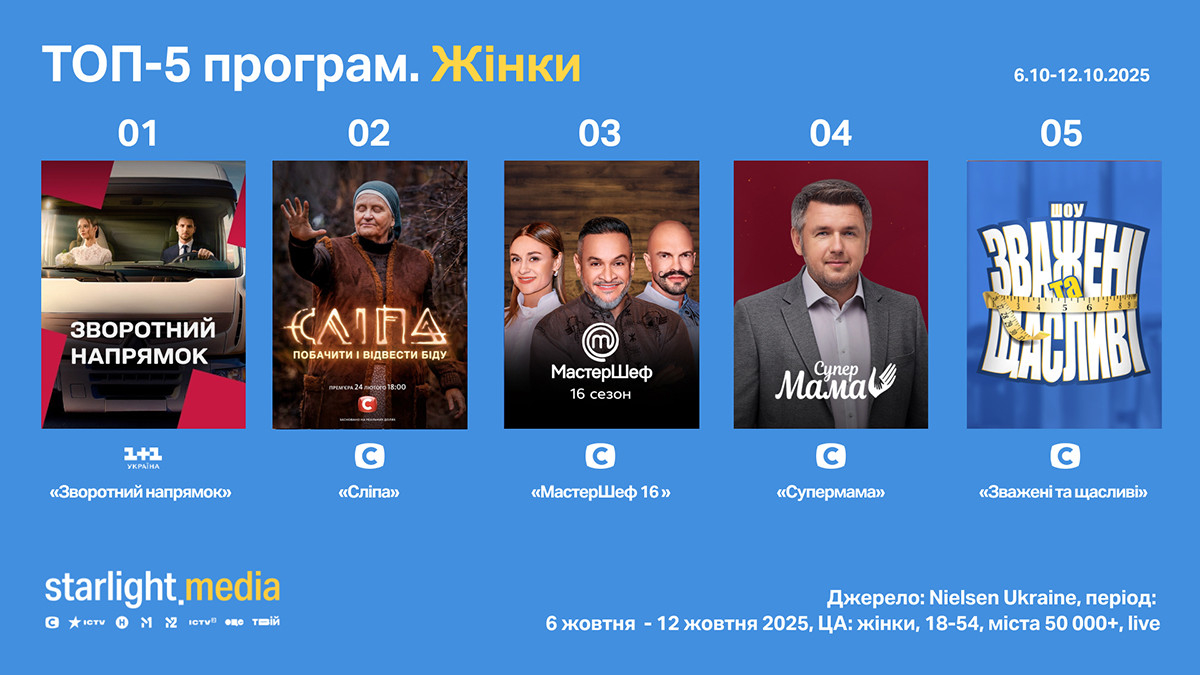 Рейтинг найпопулярніших програм тижня за жіночою аудиторією очолює серіал «Зворотний напрямок» на «1+1 Україна» (rat 3,63%, shr 13,28%). Далі — контент СТБ: серіал «Сліпа» (rat 3,2%, shr 12,94%), проєкти «МастерШеф 16» (rat 2,94%, shr 11,87%), «Супермама» (rat 2,69%, shr 12,24%) і «Зважені та щасливі» (rat 2,55%, shr 9,63%).