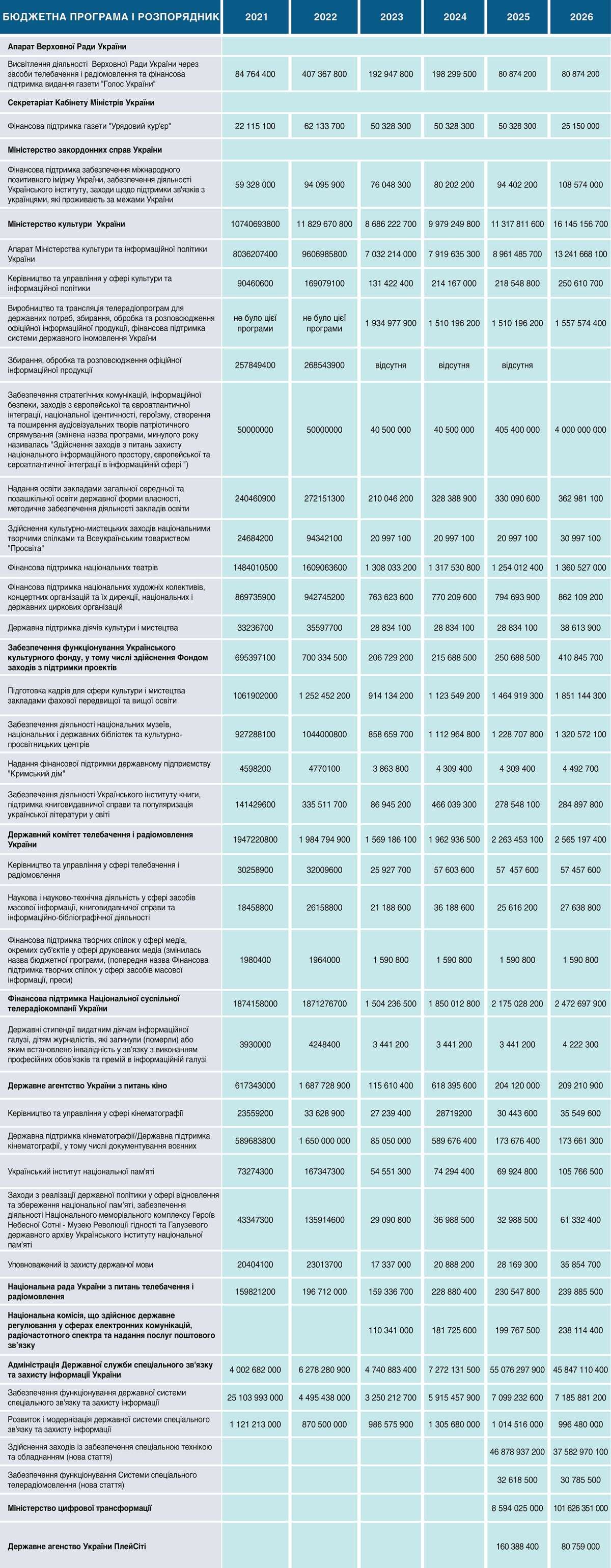 Одна з основних новацій бюджету на 2026 рік у медійній сфері — це 4 мільярди гривень, які спрямовані Мінкульту через бюджетну програму №3801030 «Забезпечення стратегічних комунікацій, інформаційної безпеки, заходів з європейської та євроатлантичної інтеграції, національної ідентичності, героїзму, створення та поширення аудіовізуальних творів патріотичного спрямування». Торік вона мала іншу назву («Здійснення заходів з питань захисту національного інформаційного простору, європейської та євроатлантичної інтеграції в інформаційній сфері») й на неї надавали 405,4 млн грн.