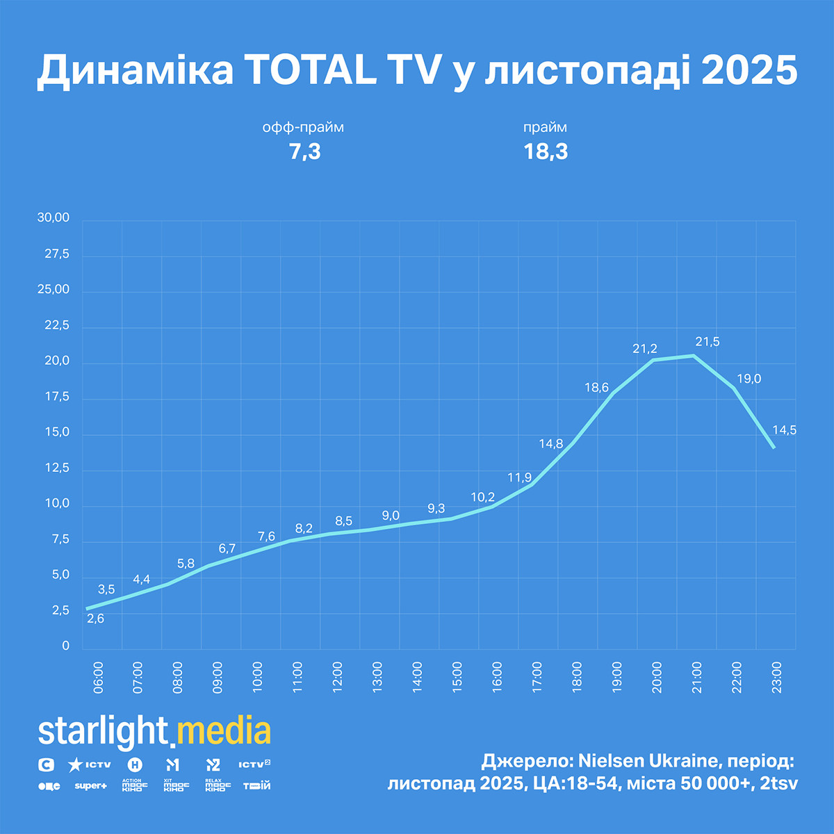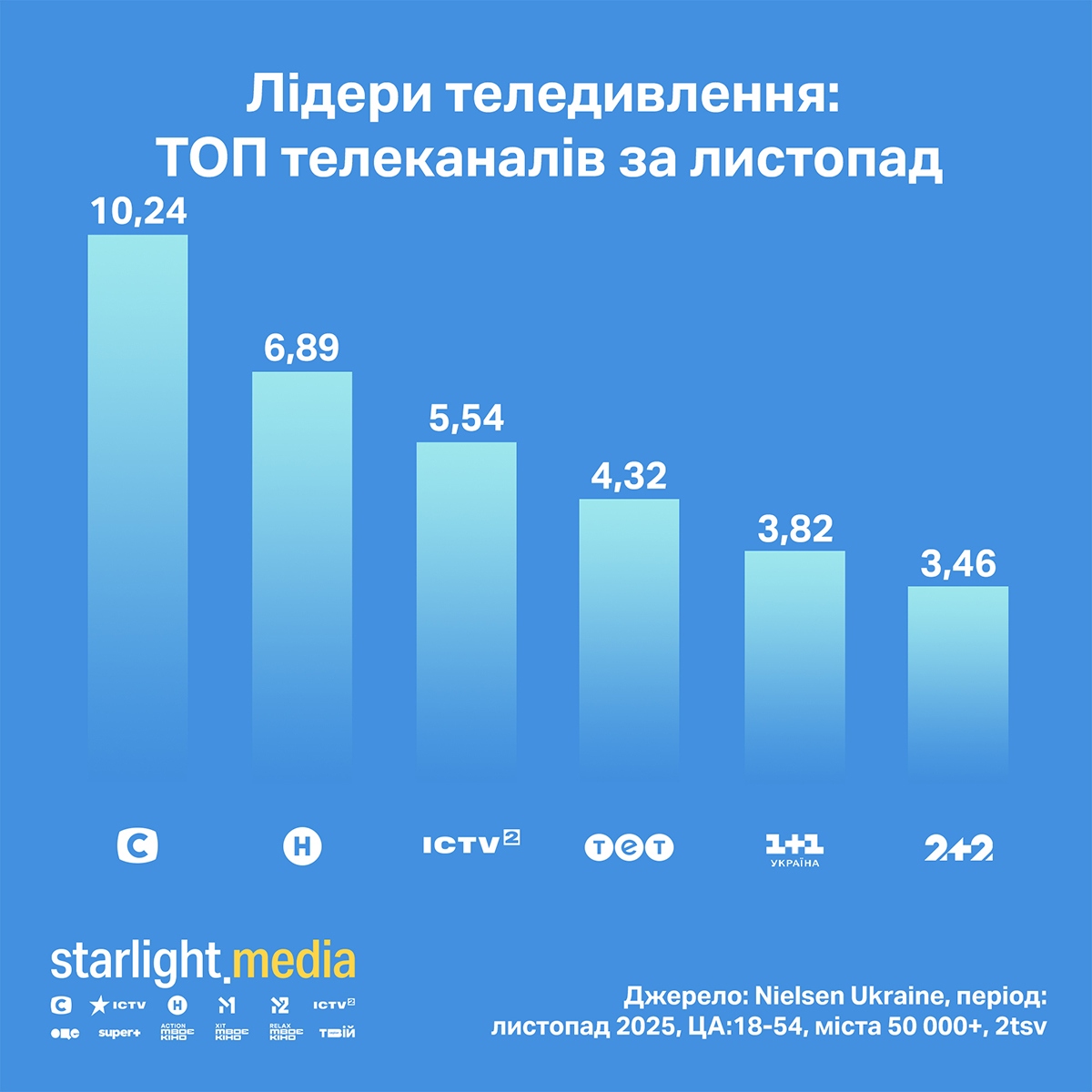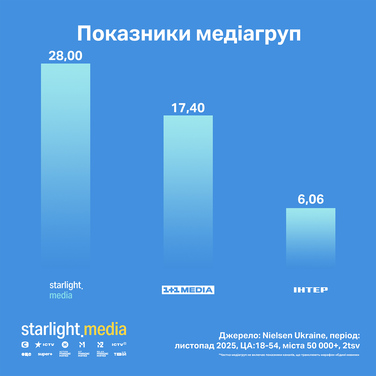 Група Starlight Media продовжує очолювати рейтинг українських медіагруп з часткою 28,00% (зростання 3% відносно попереднього місяця). На другому місці — «1+1 media» з часткою 17,40% (зменшення 2%). Трійку закриває Inter Media Group із часткою 6,06% (без змін).