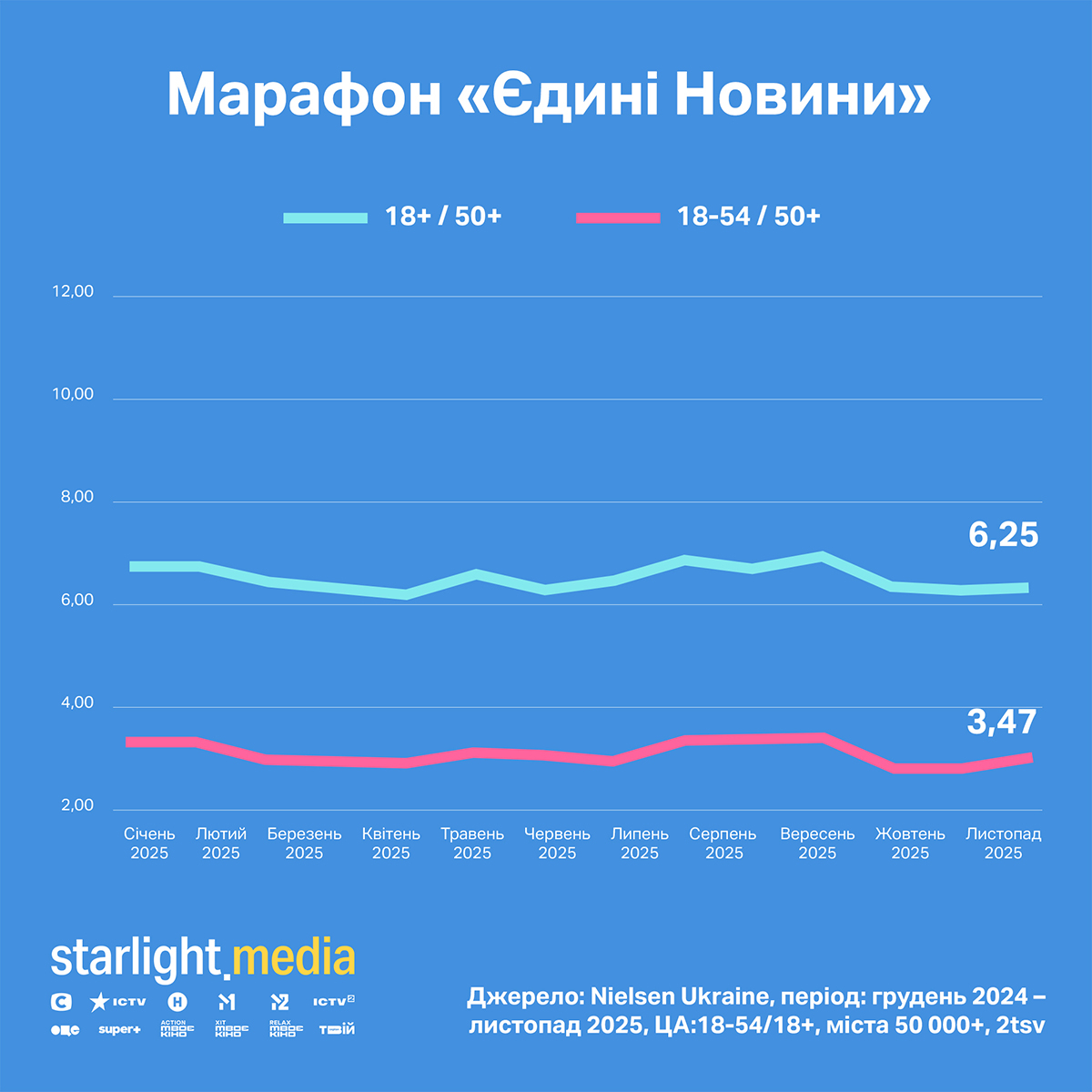 У листопаді показники каналів, які транслюють телемарафон «Єдині новини», зросли на 10% до 3,47% за комерційною аудиторією 18—54 у містах із понад 50 тис. жителів і утрималися на рівні 6,25% за широкою аудиторією 18+ 50 тис.+.