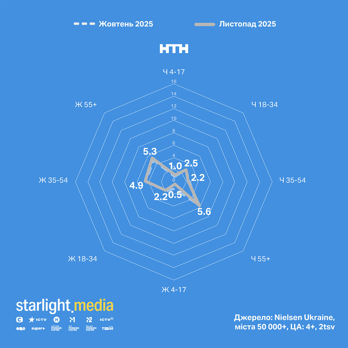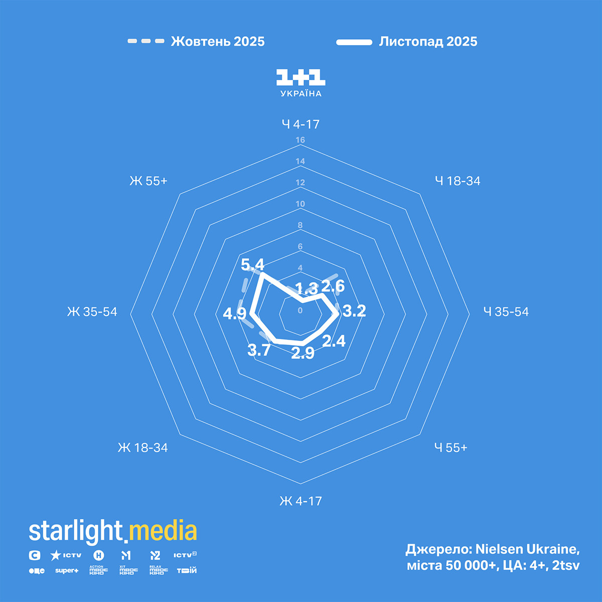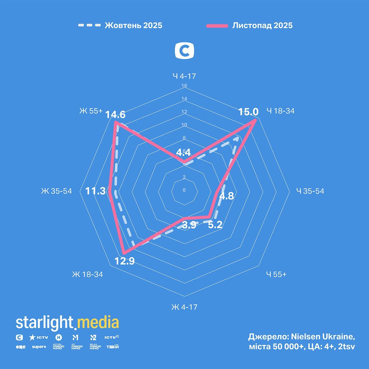У листопаді канал СТБ продовжує зростати за молоддю віком 18—34 роки, також зросли показники за жінками 35—54. Мовник утримує лідерство за жіночою аудиторією серед українських каналів.