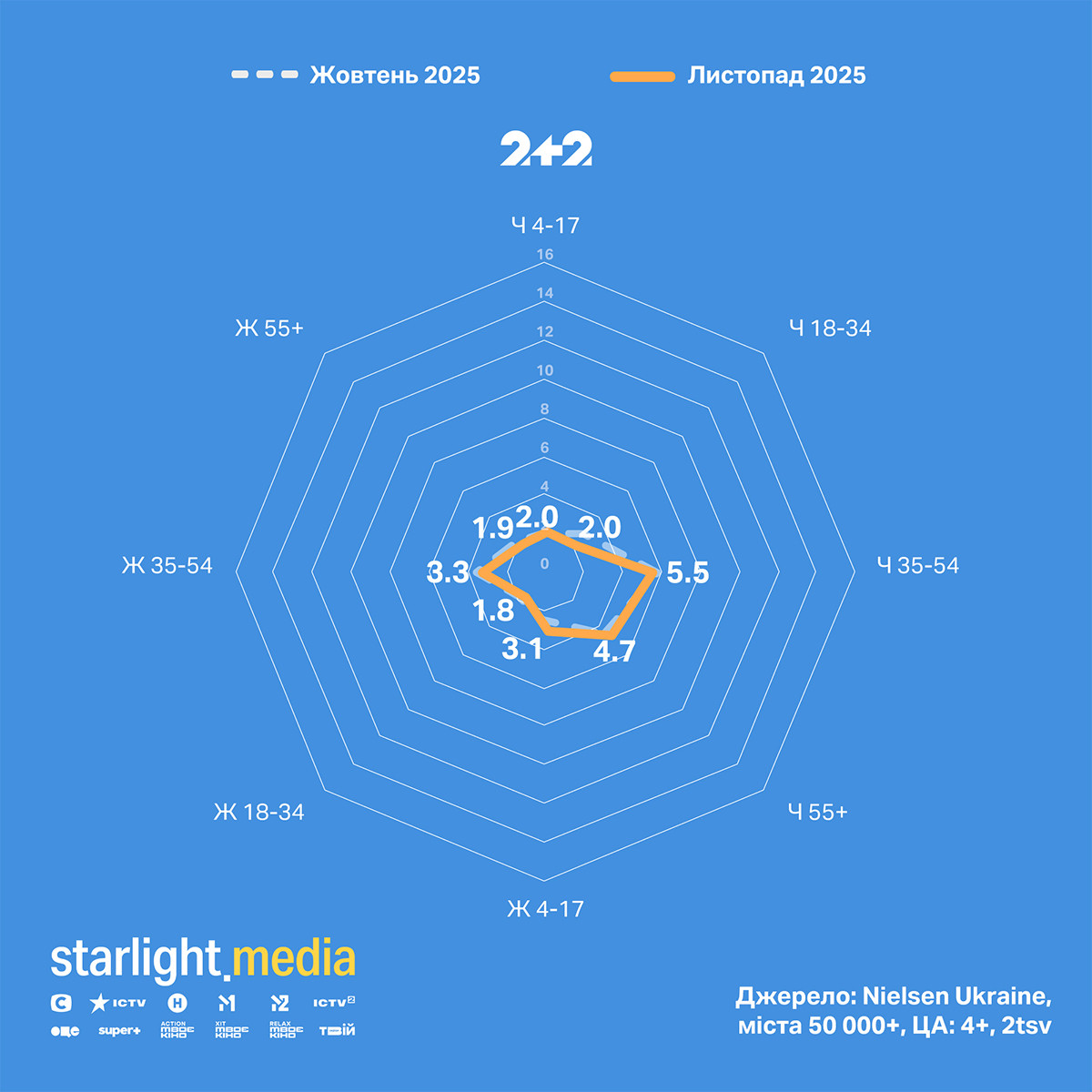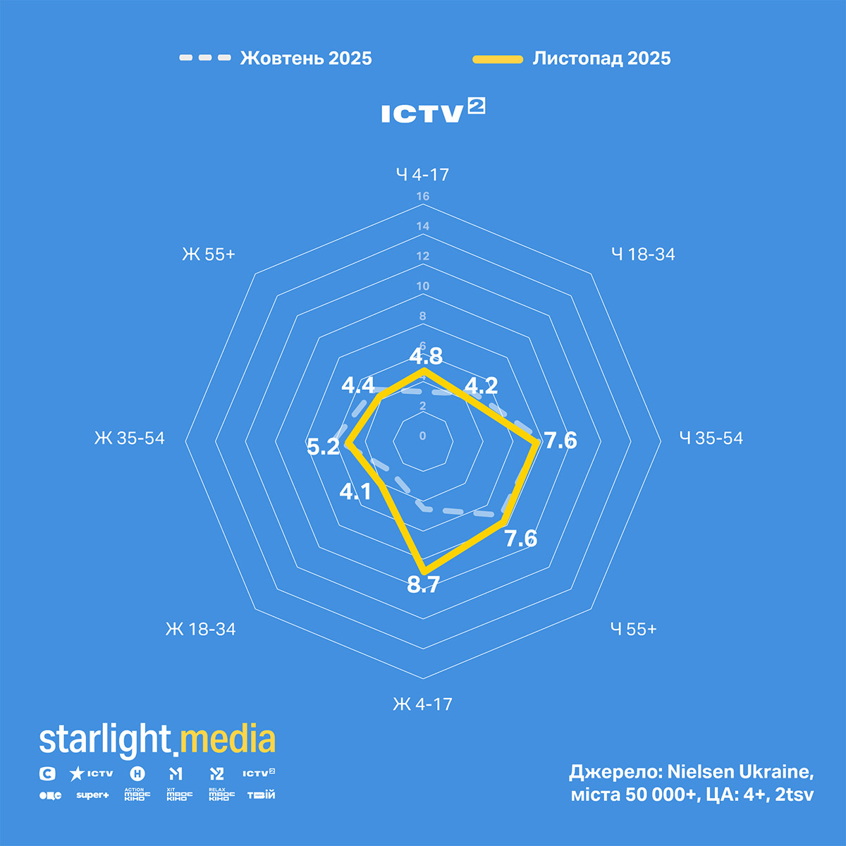 ICTV2 мав зниження частки за чоловіками 18—54 і жінками 35+. Канал лідирує за чоловіками 35—54 серед українських каналів.