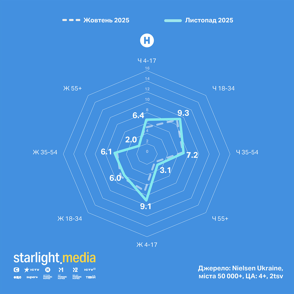 На Новому каналі зростання частки відбулося за дитячою аудиторією, а також за жінками 35+ і чоловіками 55+.