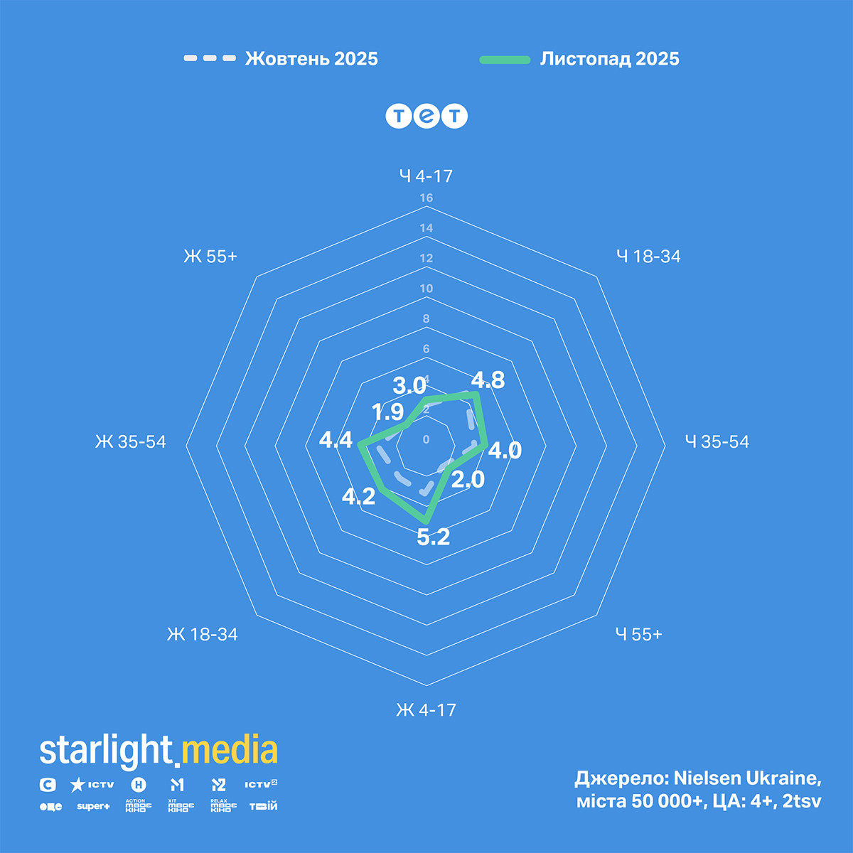 Канал ТЕТ мав зростання частки за більшістю аудиторій, особливо жінками 18—54.