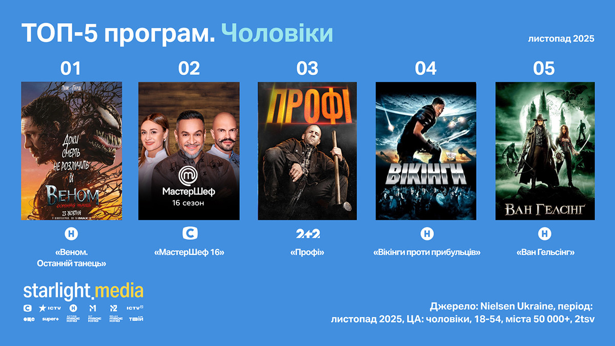 Перелік найпопулярнішого контенту за чоловічою аудиторією очолює фільм «Веном. Останній танець» на Новому каналі (rat 3,27%, shr 15,29%). Друга сходинка — за проєктом «МастерШеф-16» на СТБ (rat 2,98%, shr 13,78%). Закриває п’ятірку кінопоказ: «Профі» на «2+2» (rat 2,88%, shr 14,73%), «Вікінги проти прибульців» (rat 2,8%, shr 15,93%) і «Ван Гельсінг» (rat 2,76%, shr 12,13%) на Новому каналі.