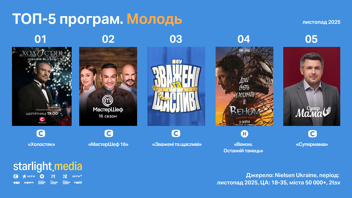 Перелік найбільш популярного контенту місяця за молодою аудиторією віком 18—35 років очолюють проєкти СТБ: «Холостяк» (rat 5,76%, shr 30,46%), «МастерШеф-16» (rat 3,8%, shr 18,9%), «Зважені та щасливі» (rat 3,49%, shr 18,54%). Закривають п’ятірку фільм «Веном. Останній танець» на Новому каналі (rat 3,19%, shr 15,54%) і «Супермама» на СТБ (rat 2,98%, shr 18,03%).