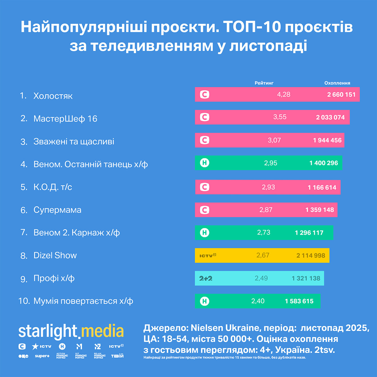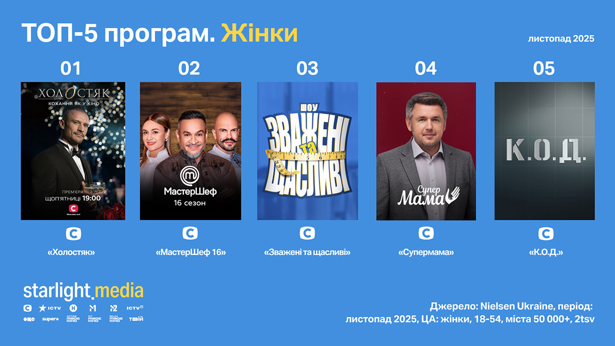 Рейтинг провідних програм місяця за комерційною аудиторією віком 18—54 у містах 50 тис.+ очолюють проєкти каналу СТБ: «Холостяк» (rat 4,28%, shr 19,95%), «МастерШеф-16» (rat 3,55%, shr 15,31%) і «Зважені та щасливі» (rat 3,07%, shr 14,37%). Четверта сходинка — за фільмом «Веном. Останній танець» на Новому каналі (rat 2,95%, shr 12,63%). Закриває п’ятірку серіал «К.О.Д.» на СТБ (rat 2,93%, shr 14,61%).