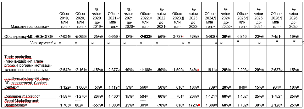 «Наш прогноз розвитку ринку на 2025 рік вцілому виправдався по всіх сегментах за винятком Event Marketing: 10% фактичного зростання проти 30% що очікувались. На нашу думку, збільшення кількості повітряних тривог, відключення світла та інші загрози воєнного часу, пов'язані з концентрацією великої кількості людей на одній локації, стримують розвиток цього сегменту. Загальний прогноз на наступний рік робити не просто. Війна продовжується, методи її ведення швидко змінюються, що безумовно має вплив на розвиток ринку маркетингових сервісів. Сподіваємось, що тренд на наступний 2026 рік залишиться без змін, але він може різко змінитися при появі нових непередбачуваних факторів впливу».